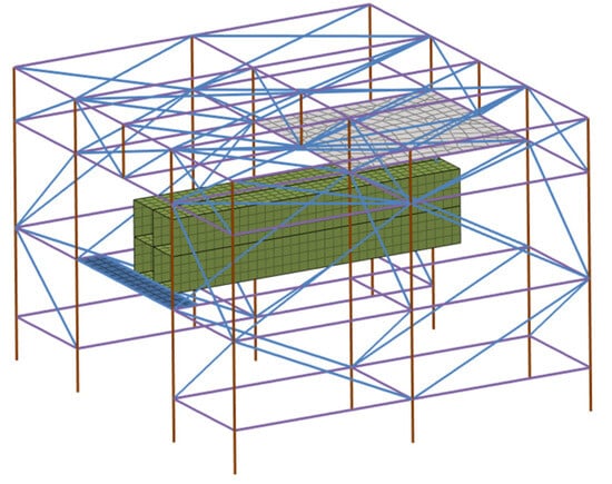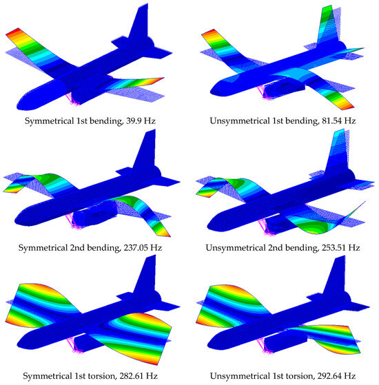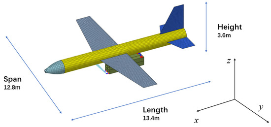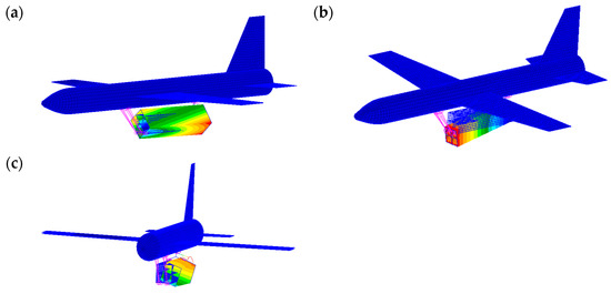 The launch unit is mounted onto an aircraft model (see Figure 15), and by solving the generalized eigenvalue problem shown in Equation (2), free boundary conditions are employed, and the modes and frequencies of the launch unit in the airborne state can be obtained, as shown in Figure 16 and Table 3, respectively. Natural modes of the launch unit in the airborne state are still manifested as the yaw, pitch and roll of the launch unit. The total weight of the aircraft is about 3900 kg; its span, length and height are 12.8 m, 13.4 m and 3.6 m, respectively. It should be noticed that the aircraft is made of simulated material with a modulus of elasticity of .
