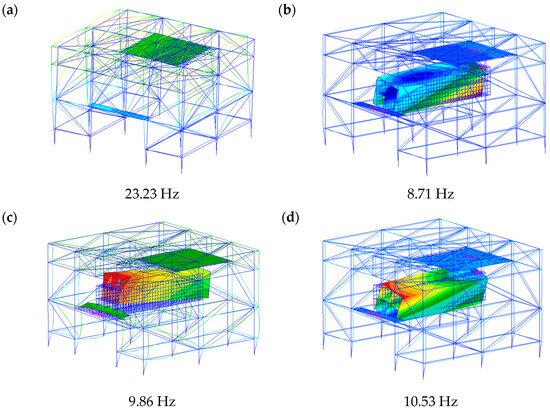 Natural modes of the launching test system before optimization: (a) the 1st order of the ground experimental structure without the launch unit; (b) the 1st order; (c) the 2nd order; (d) the 3rd order.