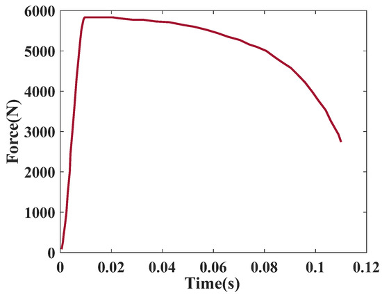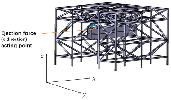 The ejection force on the launcher test system during launch is shown in Figure 10 [19]. The ejection force is applied to the middle of the upper left channel of the four channels (the point where the ejection force is applied is shown in Figure 11), and two measurement points at the front of the launcher unit (see Figure 12) are selected to observe the displacement time response when calculating the dynamics of the launcher system based on the modal superposition method [15,16]. The results of the calculations are shown in Figure 13 and Figure 14. It is seen that the peak value of the displacement response at measurement point 1 is about 23 mm (i.e., vector sum), and the peak value of the displacement response at measurement point 2 is about 28 mm (i.e., vector sum). This response must be the dynamic response obtained by coupling the vibration characteristics of the launcher and the launch unit, so it is not possible to evaluate the dynamic stability of the launch unit under the airborne condition simply by such a result.
