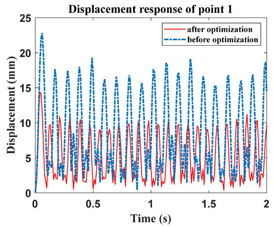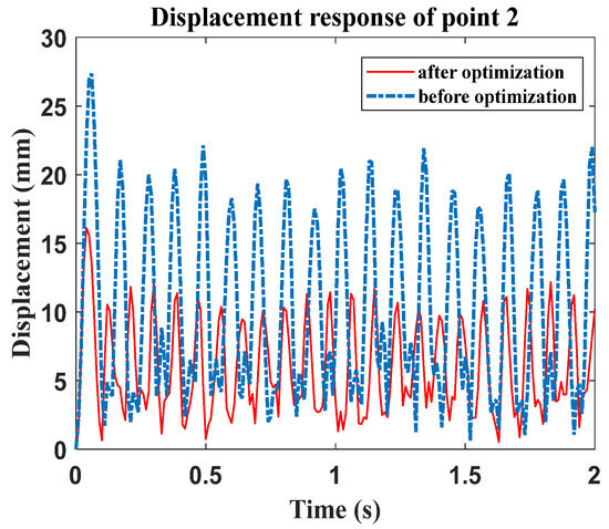 The launch ejection force shown in Figure 10 is applied to the optimized ground launcher test system, and the modal superposition method is used to calculate the dynamic response. The displacement time response of measurement points 1 and 2 are shown in Figure 13 and Figure 14, respectively. It is seen that the peak value of the displacement response of measurement point 1 of the optimized ground launcher test system is about 14 mm, and that of point 2 is about 16 mm, which are both reduced evidently compared with the results before optimization. This indicates that the influence of the mode of the launcher on the dynamic response of the launch unit is basically excluded after optimization, and the calculation results at this time are more similar to the airborne state characteristics.