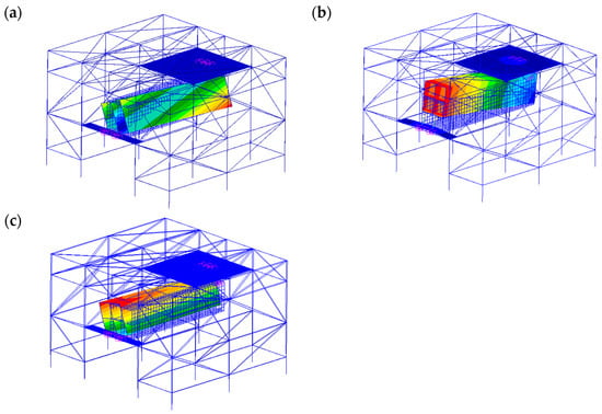 Dynamic natural modes of the launching test system after optimization: (a) the 1st order; (b) the 2nd order; (c) the 3rd order.