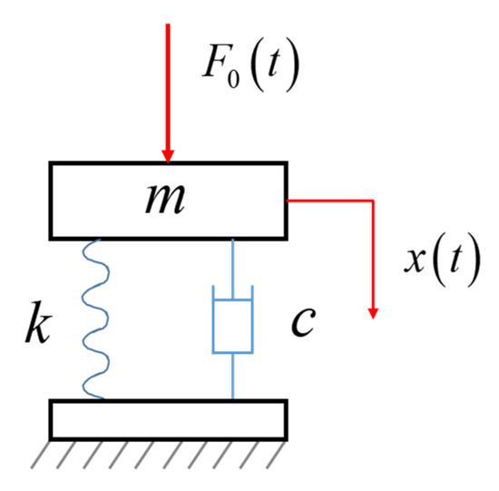 Taking a typical linear vibration system with a single degree of freedom as an example [], the working process of the Stewart platform is described. The typical vibration system with a single degree of freedom is shown in Figure 1. In the figure, is the quality of the Stewart’s vibration isolation platform, is the stiffness coefficient of the system, and is the damping coefficient of the system. When the excitation force on the Stewart isolation platform is , the displacement generated by the platform on the Stewart isolation platform is .
