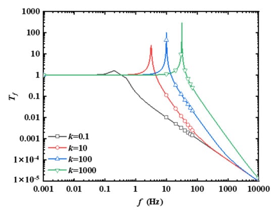 For a variable-stiffness isolation system used in vibration isolation technology, the natural frequency of the isolation system can be modulated by actively adjusting its stiffness to suppress spacecraft micro-vibrations. According to Equation (6), the relationship between the force transfer rate and stiffness of the variable stiffness isolation system can be obtained: