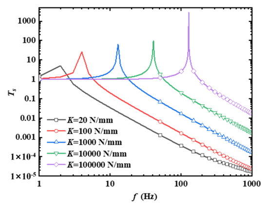 According to Equation (7), at a certain excitation frequency, the force transmission rate can be adjusted by adjusting the mass , stiffness , and damping of the isolation system.