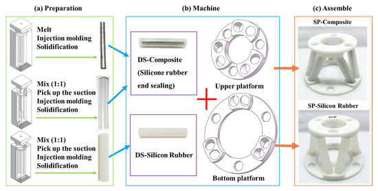 In order to verify the feasibility of the vibration isolation theory of the variable-stiffness Stewart platform, the platform was prepared based on the LMPA and verified through testing. The process of preparing the test samples is depicted in Figure 4, and the prepared samples were integrated to create the novel Stewart platform composite structure. Figure 4a shows the process of preparing the cylindrical low-melting-point alloy rod (C-LMPA, the adopted LMPA is the bismuth–tin–indium alloy (Bi57%-Sn26%-In17%), the melting point of which is 50 °C), the hollow silicone rubber column, and the solid silicone rubber column. The selected LMPA (melting point 50 °C) is encapsulated within silicone rubber to ensure structural integrity in extreme temperatures (−50 °C to 150 °C), validated via thermal cycling tests. The preparation process of C-LMPA is concluded wit the three following steps: melting, injection molding, and re-solidification. The hollow silicone rubber column and the solid silicone rubber column were prepared by mixing two parts of silicone rubber A and B (Dragon Skin 30) with equal weight. The mixture was further subjected to a vacuum for a period of 10 min to de-air, and then it was poured into the molds with a syringe and cured at room temperature []. Then, the prepared C-LMPA was added into a hollow silicone rubber column. Both ends of the composite driving column (DS-Composite) were sealed with silicone rubber, as shown in Figure 4b. Finally, the prepared DS-Composite and silicone rubber driving column (DS-Silicon Rubber) were assembled with the upper platform and the bottom platform respectively, and the Stewart platform composite structure was finally obtained, as described in Figure 4c. The performance parameters of the materials used in the sample preparation process are shown in Table 1.