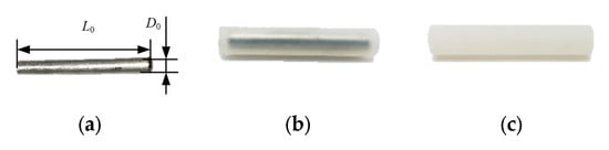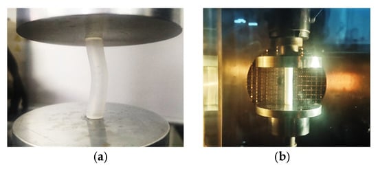 In order to study the compression performance of different driving columns at different temperatures, the compression modulus of the driving columns was measured using a compression testing machine with an environmental box. Temperature was controlled within ±0.5 °C using a PID-regulated environmental chamber. The specific compression test with temperature control is shown in Figure 6b. The driving column was installed on a test bench in the temperature-controlled box (with a size if 400 mm × 400 mm × 560 mm) that was isolated from the external temperature. The ambient temperature was set for testing, and the compression testing machine with an environmental chamber used a PID control algorithm to dynamically adjust the heating/cooling equipment based on the signals obtained from temperature sensors arranged at multiple points inside the chamber; this allowed for rapid temperature adjustments inside the temperature control chamber. The dimensions of the driving columns are shown in Table 3. Different driving columns were tested at the isothermal temperatures of 22 °C and 60 °C, with the loading rate set to 0.5 mm/min. Part of the test process is shown in Figure 6.