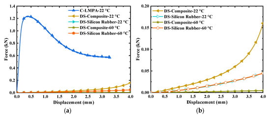 As shown in Figure 7, the compressive modulus of the DS-Silicon Rubber is 1.1 MPa at both 22 °C and 60 °C, as this silicone rubber can maintain relatively stable properties at −53 °C~232 °C. However, the compressive modulus of the DS-Composite is obviously changed at 22 °C and 60 °C.
