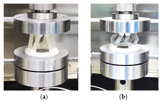 Two different types of Stewart platform composite structures were assembled using the different driving structures described above. They are the silicone-rubber-connected Stewart platform composite structure (SP-Silicon Rubber), and the soft-connected composite Stewart platform composite structure (SP-Composite). The compression testing machine with an environmental chamber was used as the compression test platform. In the test, the loading rate was set as 3 mm/min; the compression test of the platform is shown in Figure 8.