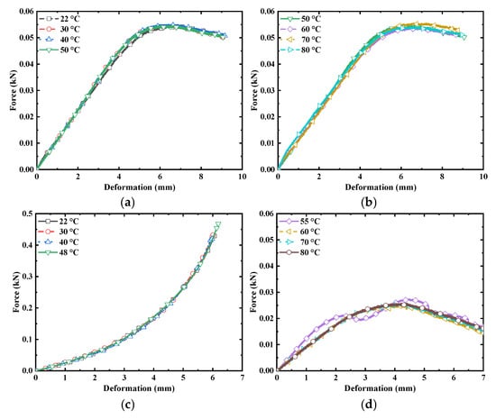 Compression force–displacement curves of the different platforms. (a) Test results of SP-Silicon Rubber at 22~50 °C. (b) Test results of SP-Silicon Rubber at 50~80 °C. (c) Test results of SP-Composite at 22~55 °C. (d) Test results of SP-Composite at 55~80 °C.