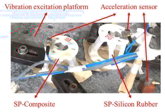 In the vibration test, the amplitude of the applied sine wave was 0.5 g, the frequency range was 5 Hz to 2000 Hz, and the scanning frequency was 1 oct/min. In order to ensure that the temperature during the test was controllable, a vibration test bench with a constant temperature box was used for the test. The SP-Silicon Rubber and SP-Composite were tested at 25 °C, 60 °C, and 25 °C (25 °C → 60 °C → 25 °C). The resulting curve is shown in Figure 10.