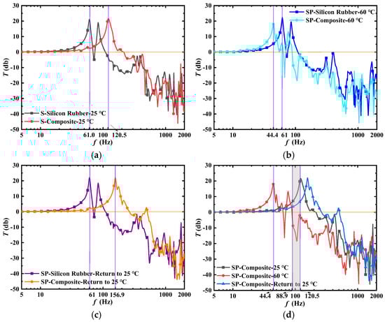 In Figure 11a–c, the SP-Silicon Rubber vibration curve remains basically unchanged at 25 °C, 60 °C, and 25 °C (25 °C → 60 °C → 25 °C). This is because the properties of the silicone rubber are stable in the environment of −53 °C~232 °C. The natural frequency of the SP-Silicon Rubber was kept stable with the value of 61 Hz. After 108 Hz, the transmission rate is below 0 db. The results show that SP-Silicon Rubber has a vibration isolation effect when the vibration frequency is greater than 108 Hz.