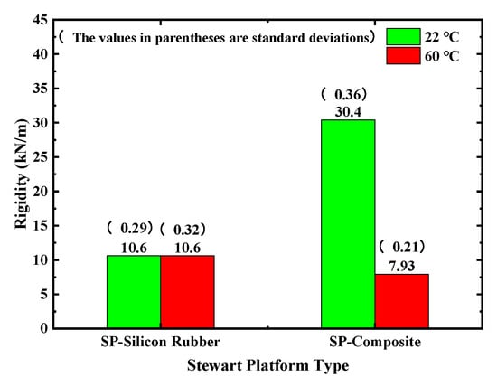 Among the platforms, the change in the structural stiffness of the SP-Composite is the largest at 22 °C and 60 °C. The structural stiffness of the SP-Composite is changed to 4 times, as shown in Figure 13. The compressive modulus of the driving column changes significantly with the phase transition of the LMPA, which further results in a change in the structural stiffness of the entire Stewart platform composite structure. The structural stiffness of SP-Silicon Rubber remains unchanged due to the stability of the silicone rubber material at 22 °C and 60 °C. The results show that the structural stiffness of the Stewart platform composite structure vary with the compressive modulus of the driving columns. This is also consistent with the findings presented in the second section, whereby the natural frequency of the structure can change with the stiffness of the structure; this can broaden the natural frequency range of the structure, thereby achieving vibration isolation and isolation functions.