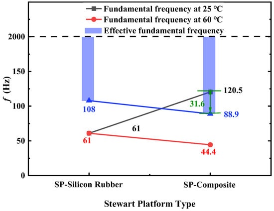 Table 6 presents the performance indicators of different platforms at different temperatures. From Table 6 and Figure 14, temperature-induced stiffness modulation enabled a resonance frequency shift of 76.1 Hz (120.5 Hz at 25 °C t 44.4 Hz at 60 °C), and the effective vibration isolation frequency range can be widened by 31.6 Hz; the structural stiffness of the SP-Composite showed a fourfold increase. These results show that the vibration effect of these Stewart platform composite structures changes with their stiffness. However, the change in the stiffness effect of these Stewart platform composite structures is caused by the phase transition of the LMPA at different temperatures. Therefore, it is possible to design and manufacture a Stewart platform composite structure, which is more suitable for low frequency and broadband frequency by making good use of the vibration characteristics of the platform caused by variable stiffness.