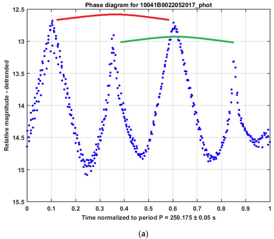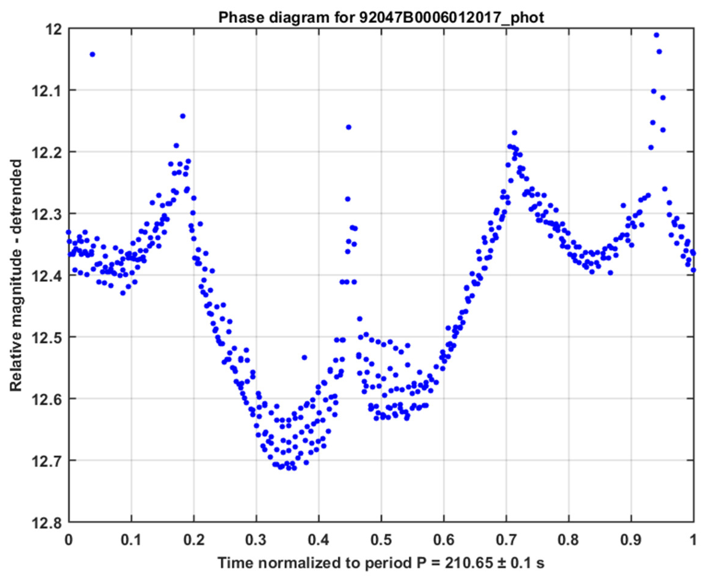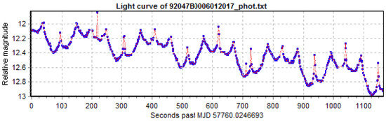 Light curves in the AIUB database are acquired with the Zimmerwald Laser and Astrometry Telescope (ZIMLAT) at the Swiss Optical Ground Station and Geodynamics Observatory in Zimmerwald. The telescope is a 1 m aperture Ritchey-Chrètien telescope on an Alt-Azimuth mount equipped with a back-illuminated CCD camera. The system performs the acquisitions on subframes of 200 × 200 pixels (2.60′ × 2.60′) to increase the light curve sampling and actively track the object in the subframe throughout the observation. The object intensity in the subframes is extracted by an automatic real-time procedure to generate the light curve. No absolute image calibration according to photometric standards is performed on the subframes. The light curve provides relative instrumental magnitudes according to a predefined calibration of the instrument based on measured optical transmissivity and quantum efficiency. If the light curve shows a repeating pattern, its period can be determined. Relative and not absolute photometric values are acceptable in this study since we are interested in the latter periodicity, for which only relative brightness changes are relevant. Linder et al. [26] discuss the advantages and disadvantages of several implemented methods to determine the periodicity in light curves. Figure 1 shows an example of an acquired light curve. A complete processing of the light curve, which includes detrending by applying a second-order polynomial fit and the Phase-diagram Reconstruction Method (PRM) [26], gives the final phase diagram as shown in Figure 2. The PRM is basically an iterative process to find the period with the smallest dispersion in the folded phase diagram. For more details about the overall processing, see [2]. Note that some outliers are present in the light curves, e.g., in Figure 1 at 225 s, and also visible in Figure 2 at 0.05, or, e.g., in Figure 3. Outliers are due to, e.g., bright stars in the background, which, if necessary, can be removed by an automatic screening procedure.
