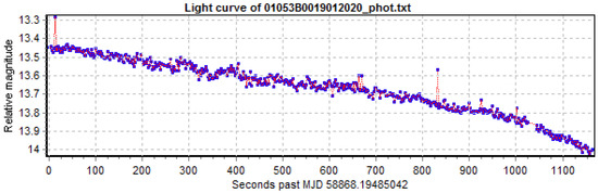 As of November 2020, the database contained light curves of 70 different GLONASS satellites. The light curves have a median duration of around 9.5 min per observation and an exposure time of 1 s. Of the 70 satellites, 51 are first-generation GLONASS (block IIv), while the rest are GLONASS-M satellites. On average, the satellites were observed more than 10 years after decommissioning. From about 83% of the light curves, a period could be extracted, while the remaining are stable (Figure 3) or slow-changing light curves (Figure 4). However, the assignment to the latter categories depends on the length of the available light curves. In the best case, as, e.g., for the satellite in Figure 3, the light curve remains stable during the 20 min maximum configured acquisition time.