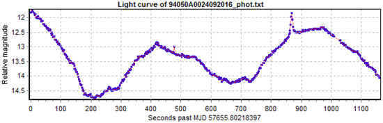 Light curves are passive optical measurements of space objects that show the variation in the observed object’s magnitude as a function of time and can be used to determine attitude states of space debris, including spin period [1,2,3] and spin axis orientation [4,5,6,7]. Recently, methods for attitude determination using spectral light curves were also proposed [8,9].