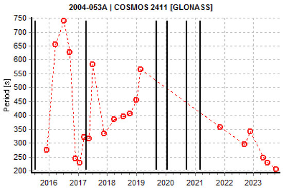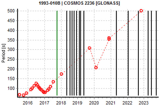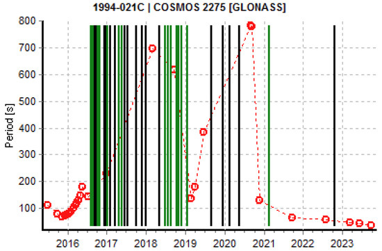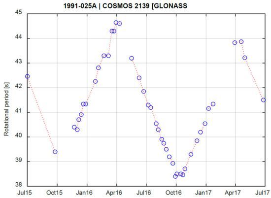 Stable or slow-changing light curves are interesting because they may show transitions from or to a rotation phase. Some satellites show slow-rotating or stable light curves already in the phase after decommissioning, while others start to show stable light curves after a regular rotation phase. The change from a regular rotation to a slow rotating phase could be a hint for a cycle between a phase of uniform motion (normal rotation) and one with a complex tumbling motion, as in the case of some GEO satellites [22]. The GLONASS satellites COSMOS 2236 (Figure 6) and COSMOS 2275 (Figure 7) start their spin period evolution “normally”, but later their spin periods become much larger and the evolution becomes more complex. This is similar to the case of COSMOS 2411 (Figure 8), although less data are available. Particularly in the first case, the cyclic pattern shows an asymptotic increase towards the peak. This behavior is similar to the one in [22], where the authors propose a mechanism driven by YORP forces and energy dissipation, where the rotation axis is cyclically aligned to the axis of minimum or maximum inertia.