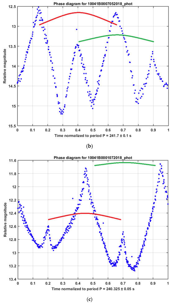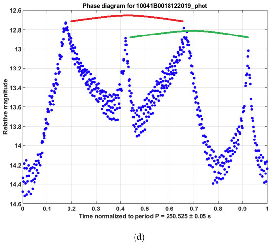 Typically, four peaks (bright reflections) are present in a phase diagram of GLONASS satellites, where the two pairs of peaks have a similar shape but different sizes, as can be seen in Figure 9. On many occasions, one pair is significantly smaller than the other. Within one pair, the distance between the peaks is usually around 180° phase. The sharp profile of the light curves suggests that the peaks are the result of specular reflection, possibly from solar panels. However, the two peaks within one pair have similar brightness and shape. We expect a different reflection from the two sides of a solar panel; one exposing the solar cells and the other probably opaque [27]. Moreover, the presence of four peaks in the GLONASS light curves cannot be explained by the simple two-fold symmetry of the solar panels in parallel configuration.