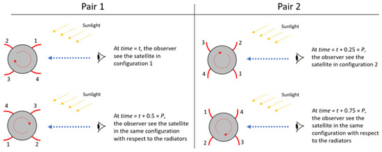 Those two rationales lead us to presume that this light curve characteristic is caused by the four thermal control flaps related to the radiators, similarly to the hypothesis in [27]. Both type IIv and type M include radiators for thermal control. In [25], the flaps are described as four curved rectangular surfaces equally distributed around the symmetrical axis of the cylindrical bus. The long side of the rectangle is parallel to the bus and is almost as long as the bus, while the width is much smaller. The flaps are fixed on one long side of the rectangle and can be rotated around this axis, i.e., opened for thermal regulation. In terms of opening direction, the flaps are arranged into two pairs (“clockwise pair” and “counterclockwise pair”), where each member of a pair is separated by 180° phase. Figure 10 explains how the arrangement of the radiators on the bus allows an observer to have similar peak profiles within one pair. As we see in the figure, at time = t, the observer sees the satellite in a specific configuration with respect to the radiators (configuration 1), which gives a specific brightness. Half a period later, time = t + 0.5 × P, the observer sees the satellite in the same configuration again with respect to the radiators, hence with similar brightness. This repeating similar configuration corresponds to one of the two pairs in the light curve. The other pair is obtained at time = t + 0.25 × P and time = t + 0.75 × P when the observer sees the satellite in another configuration (configuration 2).