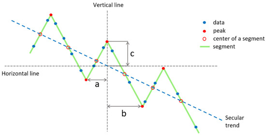 In characterizing the oscillating pattern of the spin period evolution, we use the assumption that the variations in the evolution can be empirically modeled by a series of triangular shapes having similar slopes for the left and right segments of the triangle. The segments are computed by linearly fitting observed period values. Figure 11 illustrates the basic model for the simplest case where all the triangular shapes are similar, and the secular evolution trend is linear. For each of the triangular shapes, we identify the peaks (or local extremes) of the oscillation. These are located at the intersection between two adjacent segments. We calculate the average spin period from the values of all peaks. We define the amplitude of a cycle as A = 2c, where c is the vertical distance between a peak and the line joining the center of two adjacent segments, and we calculate the average cycle amplitude. The periodicity of a cycle P is the time difference between two adjacent top peaks or two adjacent bottom peaks, i.e., P = a + b, and we compute the average cycle period. We also calculate the average secular trend of angular velocity ω per year and the average segment change of angular velocity per month within the segment. To create the whole series of triangular shapes, we first begin with a principal triangular shape, created using the two adjacent segments that possess the largest number of data points. This principal shape serves as a base for creating the rest of the series.
