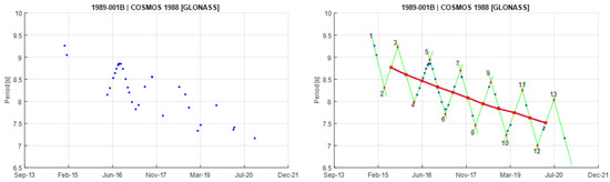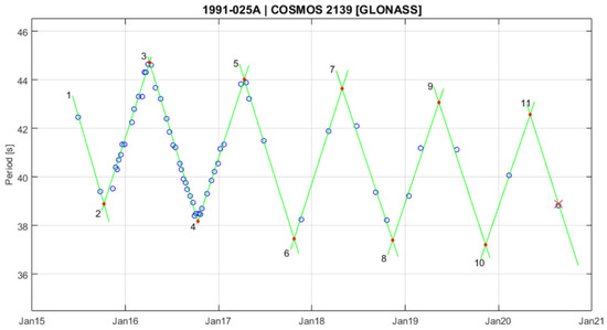 Among those satellites with a clear measured rotation, only 18 show a periodic triangular pattern in the spin period evolution. Other satellites are likely to show the same behavior, but not enough data points were measured, or they indicated a less clear pattern, not necessarily triangular, and with a smaller amplitude. Figure 5 illustrates a typical triangular oscillating pattern in the spin period. Rachman et al. [11] found that the positive/negative slope in the triangular pattern is always roughly similar. Cyclic patterns in spin period evolutions of inactive satellites have been reported, for example, in [14,17]. However, only a few of them show a consistent series of peaks with a triangular shape similar to our case.