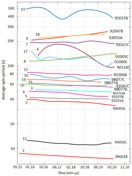 Long-term variation in the average spin period. Cubic splines are used to represent the average dynamics of the evolution. COSPAR ID and the reference object’s number in Table 2 are indicated. Time on the abscissa uses the notation mm (month) and yy (year).