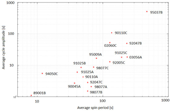 The cycle amplitude and the secular trend seem to be correlated with the average spin period, as shown in Figure 15 and Figure 16. The coefficients of correlation are 0.84 and −0.45, respectively. Note that the latter correlation is about 0.93 if angular velocity instead of spin period is considered. Similarly, the segment change correlation with the spin period is 0.75. This means that objects with higher spin rates tend to have a higher change in the spin rate, or angular acceleration, in both the annual cycle and the secular trend.