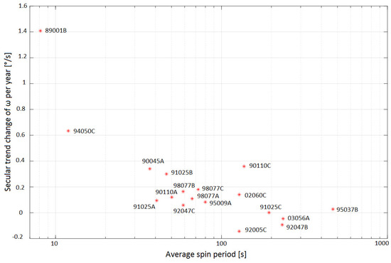 Figure 14 shows the long-term variation in the average spin period. We can see that most of the objects have a diminishing trend, i.e., they tend to rotate faster during their lifetime. In particular, all the objects with a spin period less than 100 s show a decrease in the spin period, while the remaining objects seem not to show any specific trend.
