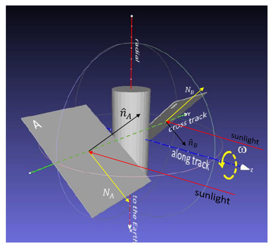 Modeling the effect of different optical properties of the satellite components at the time of the simulations was not yet supported by iOTA. Therefore, for those simulations, another software called D-SPOSE Version 1.0.1 was employed. The software was developed for the analysis and prediction of the rotational motion of space debris to determine the evolution over a time scale of years [29]. Although both tools support different perturbation forces, in the orbital model, only the gravitational force of the Earth point mass was taken into account, while in the attitude model, only the solar radiation pressure (SRP) was considered, since this is predominant for the attitude behavior of the selected object in that orbit regime [30]. The total torque due to SRP is given by the sum over all illuminated facets of the satellite , where a is the vector from the satellite’s center of mass to the i facet and is the applied force [31]: