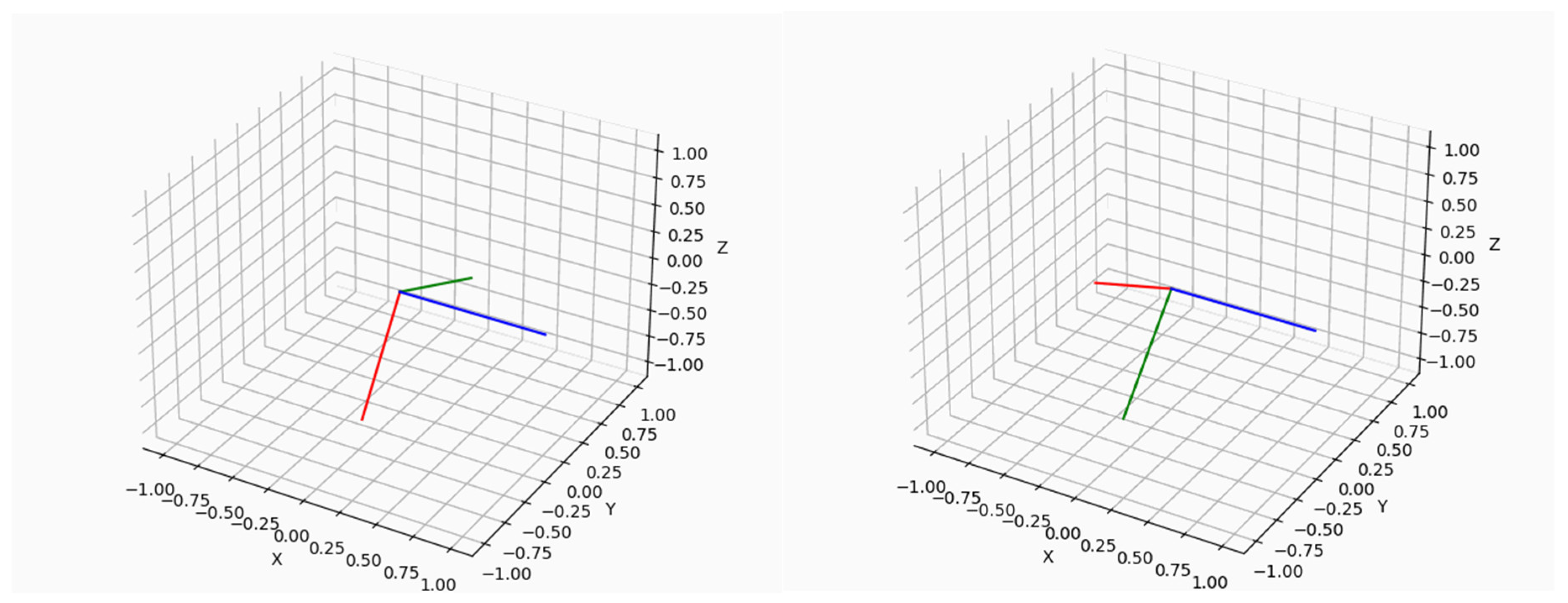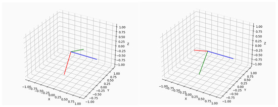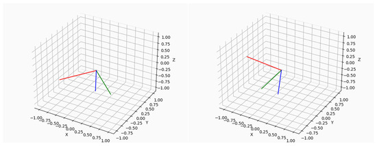 Initial attitude motion of the object with rotation about the wheel axis (blue vector). The red, green, blue vectors represent the three axes x, y, z in the body-fixed coordinate system, while the X, Y, Z axes define the inertial system. Red and green vectors indicate the rotation, moving from one position (left) to a rotated one (right).