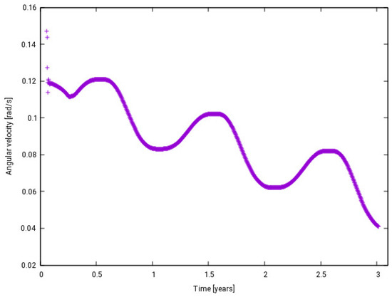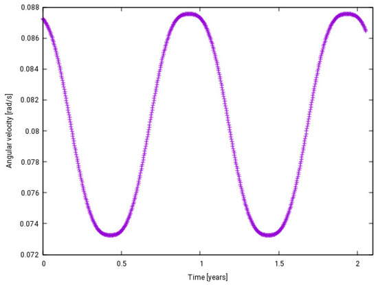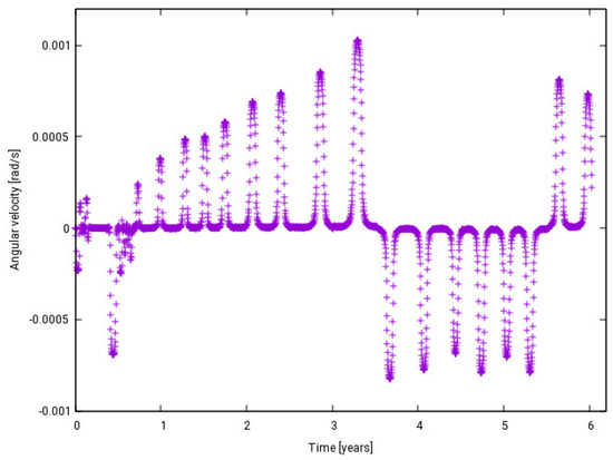 The initial rotation velocity is decisive for the spin evolution. Simulations with no initial satellite rotation show an irregular increase in the spin rate, followed by a decrease back to a status with almost no rotation. Figure 22 exhibits the evolution of the angular velocity about the body-fixed z axis. The explanation of this behavior is related to the precession motion of the satellite previously mentioned. In fact, the satellite changes the orientation during the precession and when the Sun starts to illuminate the back of the “wind wheel” instead of the front part, the opposite rotation is induced. As a consequence, the spin rate decreases and returns to the initial state. Since the precession motion depends on the orientation, the sequence of these cycles is not regular, as can be seen in Figure 22, and tends to have an unpredictable behavior. Simulations with other initial orientations indicate a similar irregular behavior.