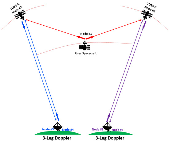 User spacecraft’s one-way Doppler (OWD) tracking configuration with two TDRS satellites. Node #1 represents the position of the user satellite in space, whereas Node #2 denotes the location of the TDRS in space. Node #3 and Node #4 are identical ground stations used for transmitting and receiving signals in relation to Node #2. These ground stations are different for both TDRSs. By differencing two OWD measurements taken between the user spacecraft and two TDRS satellites, Differenced One-Way Doppler (DOWD) measurements are obtained.