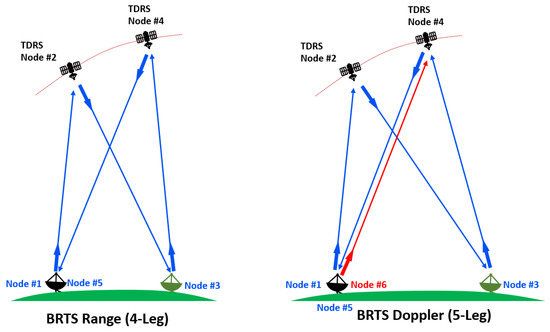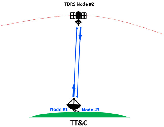 The measurement of the range utilizing four-legged methodology entails measuring the duration of propagation for a radio signal traveling from a transmitter (Node #1) to a receiver (Node #5); see Figure 3. Specifically, the process involves the emission of a signal from the ground station (Node #1) to the TDRS satellite (Node #2), which is subsequently retransmitted by the satellite’s transponder to the BRTS transponder (Node #3). After receiving the signal, the BRTS transponder sends it back to the TDRS (Node #4), which ultimately forwards it to the ground station (Node #5).