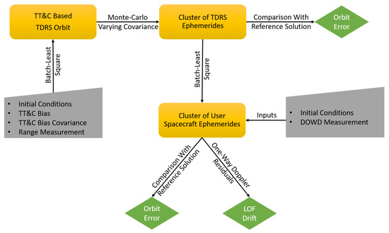 Figure 4 depicts the schematic of the analysis setup used in this study. The initial step involves the selection of user spacecraft that have been supported by the FDF for DOWD analysis, as described in Section 4.3. Once the user spacecraft is identified, the list of the TDRS satellites used for acquiring DOWD measurements is determined. In the subsequent step, the TDRS orbit is reconstructed using TT&C measurements and weighted Batch Least Squares (BLS) techniques.