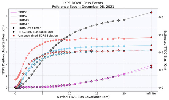 The figure shows the relationship between TDRS positional uncertainties (solid line, circles) and estimated TT&C biases (dotted lines, diamonds) during IXPE DOWD pass events, analyzed against the a priori covariance of TT&C measurement bias.