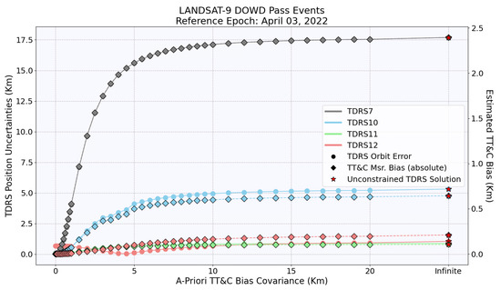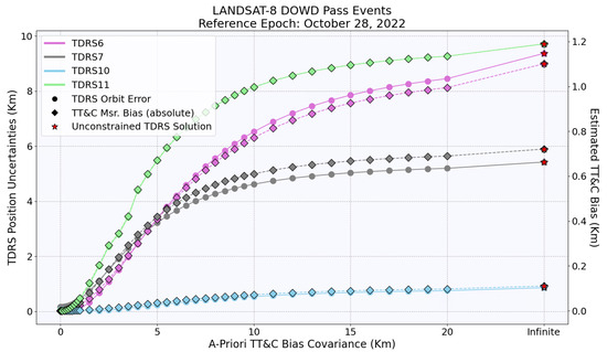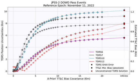 Initially, as the a priori covariance increased, TDRS orbit errors increased rapidly. However, the errors stabilized after reaching a certain threshold. With further increases in a priori covariance, there were slight changes in the TDRS orbit and estimated TT&C bias. This indicates that the solution’s dependence on the a priori TT&C bias covariance can be resolved to a large extent with a very high value but at the cost of poor orbit accuracy.