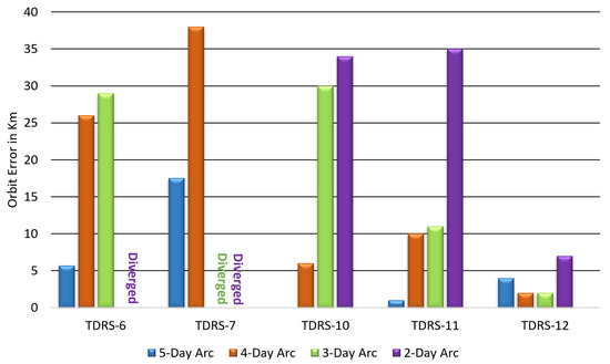For instance, the LANDSAT-8 spacecraft exhibited a significant error, even for similar cumulative errors in the TDRS orbit. This can be attributed to the limited number of usable DOWD passes. Only three passes were available due to a TDRS maneuver, and one of these was sigma edited out by GTDS because of increasing orbit uncertainties. DOWD generally requires a minimum of four passes for a reasonable orbit solution, as short arcs of data are typically insufficient to provide reliable estimates. As a result of the limited DOWD passes, the estimated LANDSAT-8 solutions were not highly accurate. This situation represents the worst-case scenario in terms of the quality of the solutions obtained.