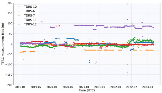 Nevertheless, not accounting for TT&C measurement biases is still a viable choice in these studies compared to overestimating biases. As shown in Figure 12, estimated TT&C biases were consistently below 50 m for five years except for TDRS-12, where bias consistently remained around 82 m since the late 2020s.