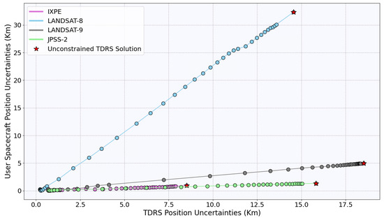 Insufficient knowledge about the TT&C bias and its covariance can lead to significant errors in the orbits of the TDRS satellites. As a result, the user spacecraft’s orbit determination accuracy can be severely affected. Any error in the TDRS orbit can propagate to the user spacecraft orbit and cause substantial errors in the determination of its position and velocity. To illustrate this impact, Figure 13 demonstrates the impact of the TDRS orbit error on the user spacecraft’s orbit. The plot shows the relationship between the error in the user spacecraft’s orbit and the cumulative error in the TDRS orbit. Each point on the plot represents a unique solution obtained using the TDRS orbits described in Section 5.1.3. Remarkably, despite being in different orbital configurations, the errors in all user spacecraft’s orbits were linearly related to the errors in the TDRS orbits.