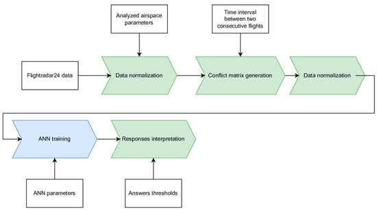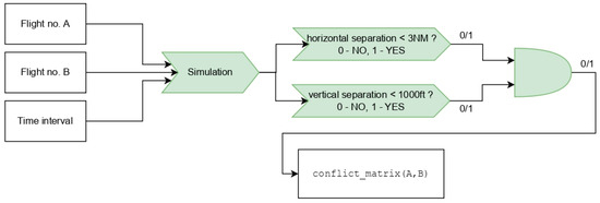 The next step is to prepare a dataset for training the ANN. After collecting and normalizing the data describing the trajectories of flights, the following scenario is simulated: the first aircraft crosses the boundary of the analyzed airspace, a specified time interval passes, and the second aircraft crosses the boundary. Both aircraft continue along their respective trajectories. If separation is lost before either aircraft reaches the ground, the case is classified as 1 (conflict). If separation is maintained, the case is classified as 0 (no conflict). As previously stated, a loss of separation occurs when horizontal separation is reduced to below 3 NM while vertical separation simultaneously drops below 1000 ft. The flowchart of the described algorithm is shown in Figure 7.