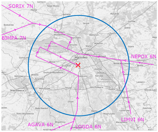 The choice of Warsaw Chopin Airport airspace (Figure 2) was driven by its high traffic density and therefore the ease in obtaining the appropriate data. The airport features two intersecting runways: 11/29 and 15/33 [29]. The decision to analyze arrivals to RWY11 was based on the prevailing meteorological conditions (wind direction) at the time of data acquisition. There are six Standard Instrument Arrivals (STARs) to RWY11 [30]: SORIX 7N, BIMPA 7N, NEPOX 6N, LIMVI 6N, AGAVA 6N, LOGDA 6N. To simplify the calculations, it was assumed that the analyzed space is a circle with a radius of 25 NM and the center at the ARP (Aerodrome Reference Point) of EPWA airport (Warsaw Chopin Airport) (Figure 3).