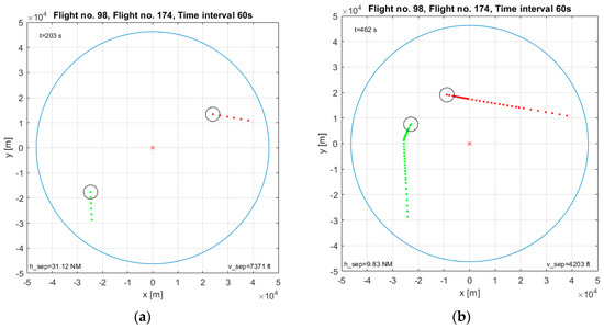 It is important that, whenever possible, the air traffic control service ensures that flights follow the shortest direct route or use shortcuts, especially during off-peak hours [29]. As a result, the expected flight paths may differ significantly from the standard ones. This is evident in the sample visualizations of arrivals in the non-conflict case (without loss of separation) and conflict case (with reduced separation) shown in Figure 4 and Figure 5, respectively. In this context, a loss of separation refers to a reduction in horizontal separation to below 3 NM, along with a simultaneous reduction in vertical separation to below 1000 ft. The visualizations include the boundaries of the analyzed airspace (blue circle), the EPWA airport ARP (red cross), and the subsequent positions of both aircraft (marked with dots). The aircraft positions are surrounded by circles with a radius equal to half the minimum horizontal separation (1.5 NM); the intersection of these circles indicates that the distance between the aircraft is below the minimum horizontal separation. The aircraft that first crossed the area boundary is marked in green, while the second one is marked in red. The quantities h_sep and v_sep denote the current horizontal and vertical separation, respectively, while t represents the time measured from the beginning of the simulation.