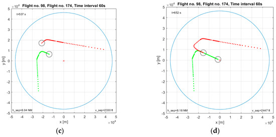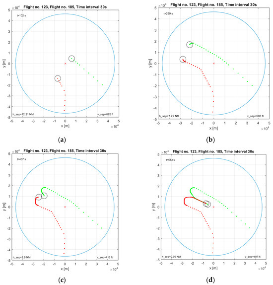 Visualization of the conflict case: (a) situation just after entering the analyzed airspace; (b) approach of aircraft with a converging course; (c) loss of separation (2.9 NM horizontal separation and 413 ft vertical separation); (d) continuation of the approach with loss of separation. Aircraft that first crossed the airspace boundary is marked in green, while the one that crossed second is marked in red.