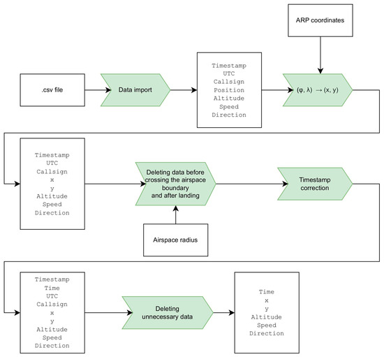 The first stage of the system development process involves normalizing the data describing aircraft trajectories to extract the segment relevant to the warning system—specifically, from the moment the aircraft crosses the boundary of the analyzed airspace until landing. The source of flight trajectory data is the Flightradar24 website, which collects information from over 40,000 ADS-B receivers worldwide [33]. These data can be downloaded in .csv format. The file includes the timestamp (Timestamp), UTC date and time (UTC), aircraft callsign (Callsign), position coordinates (Position), pressure altitude (Altitude), groundspeed (Speed), and course (Direction). The time interval between successive lines in the file is not constant, typically ranging from a few to several seconds while the aircraft is in flight.