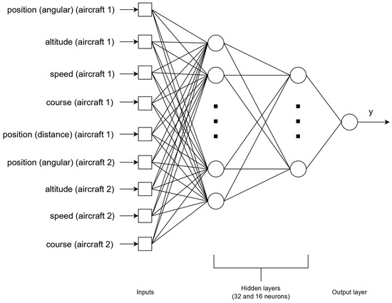 The neural network has 9 inputs, representing the following parameters at the moment the second aircraft crosses the boundary of the analyzed airspace: position (angular), altitude, speed and course of both aircraft, and distance of the first aircraft from the ARP. The distance of the second aircraft from the ARP is always equal to the radius of the analyzed airspace, so it does not need to be included as an additional input. The initial parameters described above were transformed into 9 -element input data vectors, corresponding to each of the n examples. As stated in [28], before training the neural network, all input data from the training set must be normalized to the range [0, 1]. Each value was normalized using the following general equation:
