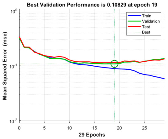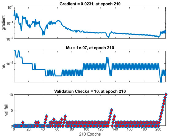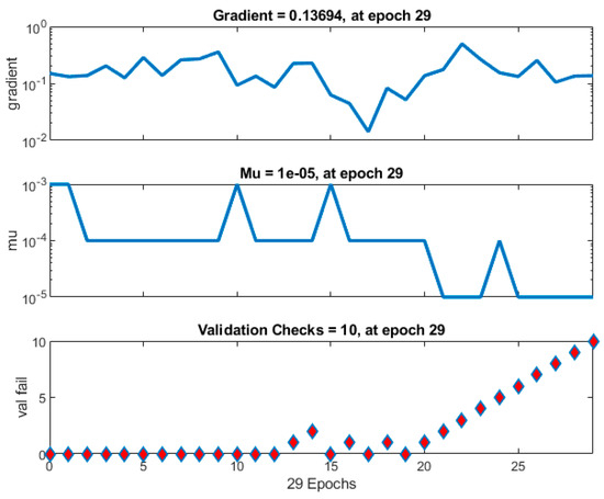 The visualization of the training process for is presented in Figure 9 and Figure 10. Figure 8 shows the value of the MSE, which serves as the cost function for each of the three data subsets (training, validation, testing) as a function of the number of epochs. The lowest value of the cost function calculated for the validation data (MSE = 0.10829) and its corresponding epoch no. 19 are marked—this represents the final form of the network used in the remainder of the study. Figure 10 displays the values of Gradient, Mu, and Validation Checks as a function of the number of epochs. The training process was terminated as a result of exceeding the maximum number of failed validation checks, as further training would have led to overfitting the network.