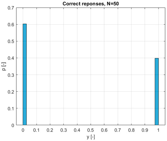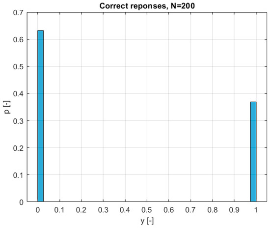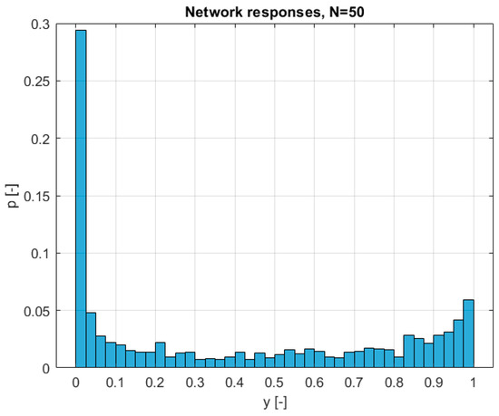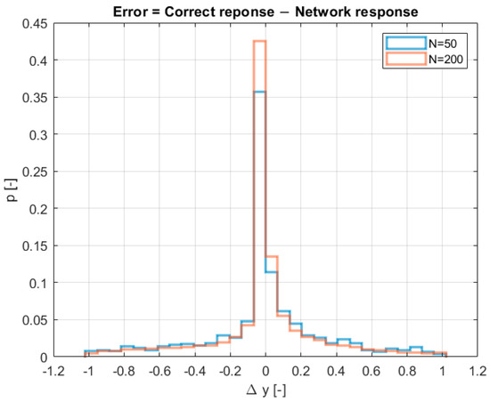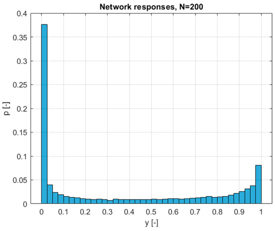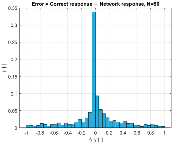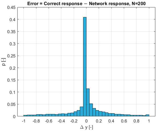 The network’s performance can be assessed by analyzing the graphs in Figure 11, Figure 12 and Figure 13, which are based on the testing data. The graph in Figure 11 shows the normalized histogram (with the heights of the bars selected so that the sum of their areas is 1) of the network response—the percentage of responses contained within the given intervals . In a perfectly functioning model, this histogram should be identical to the one in Figure 12, which displays the normalized correct responses. The significant number of responses close to 0 and 1 indicates that the intended classification behavior was achieved. However, comparing the graphs in Figure 11 and Figure 12 does not provide information into how closely the network responses align with the correct ones. Inferences in this area can be derived from the graph in Figure 13, which contains a normalized histogram of the difference between the correct responses and the network responses (error ). A strong concentration of error values around 0 indicates that the network is working correctly in the vast majority of cases. The absence of a significant number of errors with values 1 and −1 indicates that there are few large errors (i.e., complete failures to recognize the conflict).