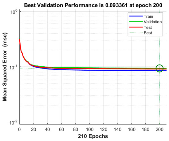 As in the case for , the training process was terminated upon exceeding the maximum number of validation checks. The visualization of the training process is presented in Figure 14 and Figure 15. The lowest cost function value (MSE = 0.093361) for the validation data was achieved in epoch 200, which is 13.8% lower than the value obtained for .