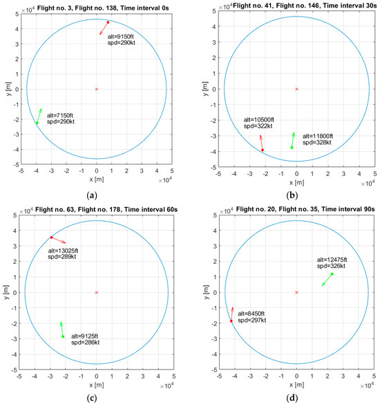 Visualizations of example initial situations in which the network correctly predicted an impending conflict: (a) Flight no. 3, Flight no. 138, Time interval 0 s; (b) Flight no. 41, Flight no. 146, Time interval 30 s; (c) Flight no. 63, Flight no. 178, Time interval 60 s; (d) Flight no. 20, Flight no. 35, Time interval 90 s.
