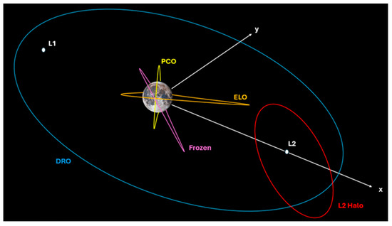 - Zimovan, E.M.; Howell, K.C.; Davis, D.C. Near rectilinear halo orbits and their application in cis-lunar space. In Proceedings of the 3rd IAA Conference on Dynamics and Control of Space Systems, Moscow, Russia, 30 May–1 June 2017; Volume 20, p. 40. [Google Scholar]